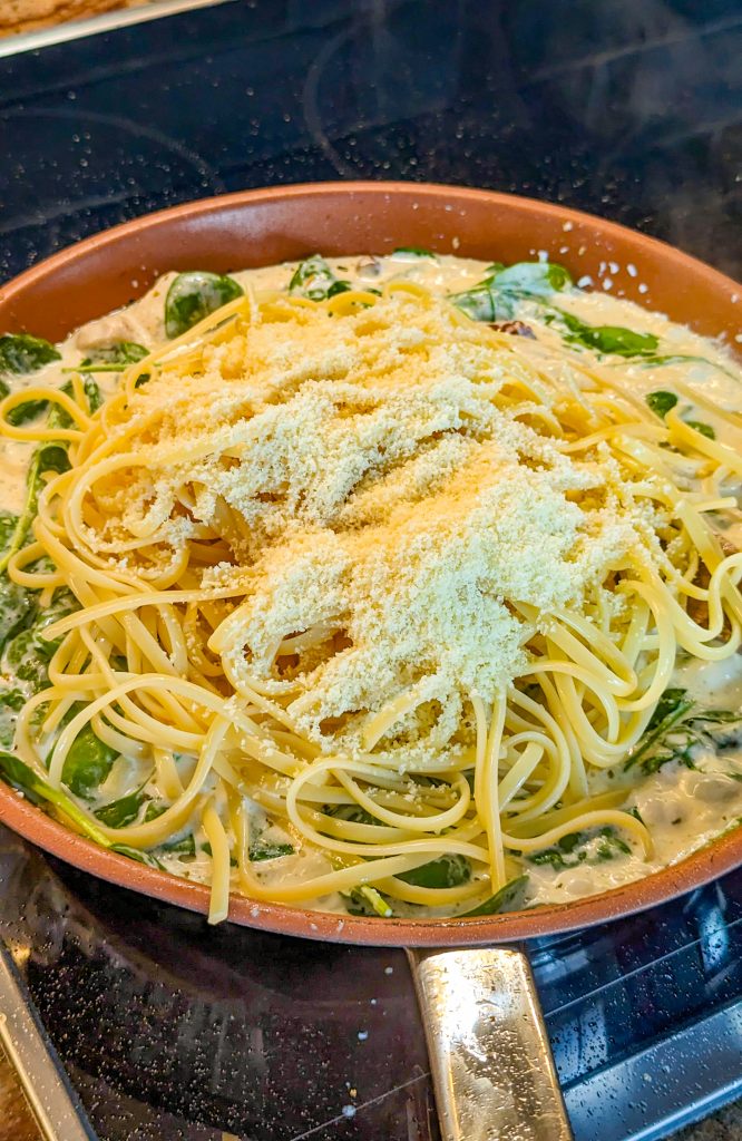 7. Turn the heat right now and stir in the parmesan cheese, then add the spinach and cook until wilted.