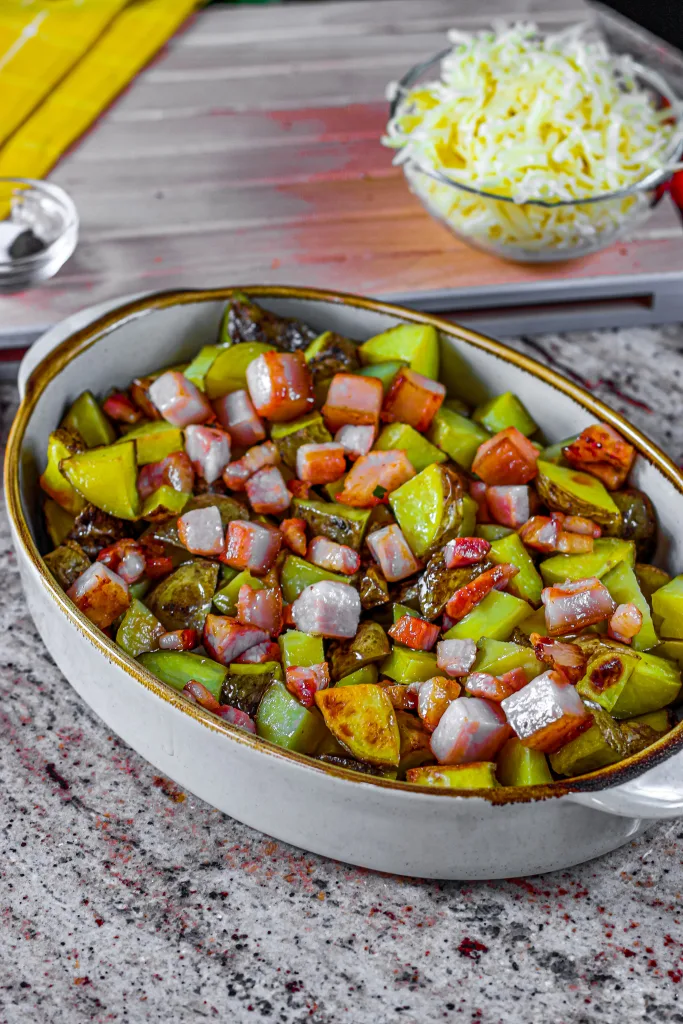 The casserole is made with baked Yukon gold potatoes, which end up being tender and flavorful. We add a layer of melted mozzarella and cheddar for that cheesy texture. To enhance the recipe, add crunchy, crispy bacon cooked to perfection. The casserole is baked to let the flavors meld, creating a satisfying meal for the whole family.